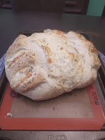 En una recipiente agregamos la harina, azúcar, levadura, mantequilla derretida, huevos, leche tibia y sal, mezclamos bien y amasamos hasta tener una masa suave y que no se pegue, se deja leudar por 1 hora ó hasta que doble su tamaño, se divide en dos partes ó en una sale un pan grande se bolea hasta formar una bola grande y con un cuchillo filoso le hacemos cortes a las largo del pan, vamos a meter queso en todas las cortaduras y vamos a barnizar con mantequilla, ajo, pimienta y orégano ó perejil, se deja leudar 15 min mientras se precalienta el horno a 180 grados centígrados y horneamos por 30 a 35 minutos ó hasta que se vea dorado.